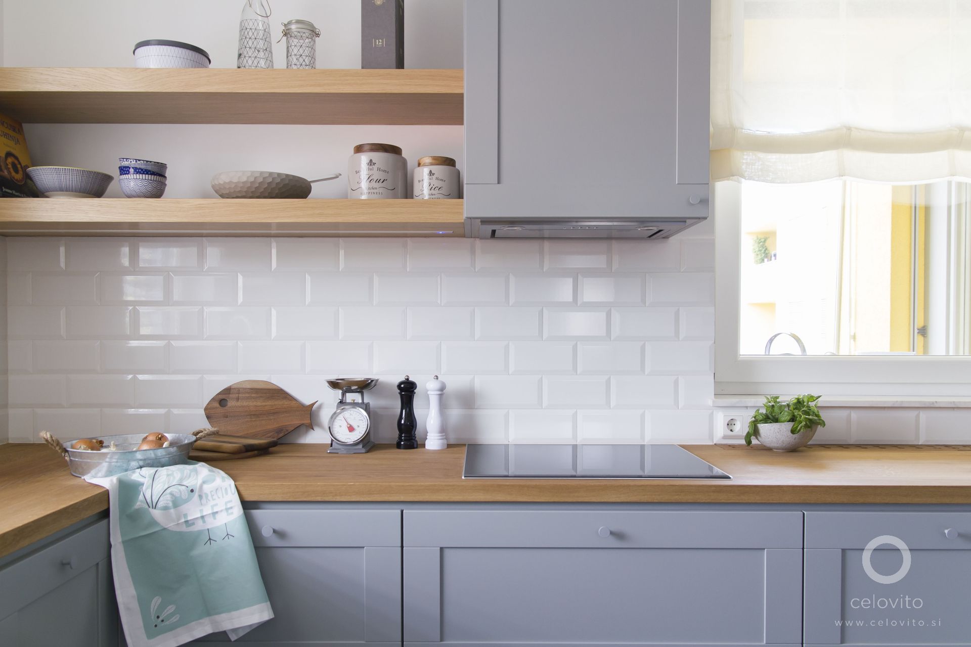 V kuhinji, kopalnici, na stranišču in v shrambi stene ščitijo in obenem krasijo klasične a elegantne metro ploščice (subway tiles). Občutek domačnosti smo ustvarili s tradicionalno oblikovano kuhinjo z velikim keramičnim pomivalnim koritom. Čeprav je videz kuhinje zelo klasičen, pa ima vse, kar potrebuje moderna kuhinja. Kuhinjske fronte smo obarvali v sivo-modro, ki je obenem tradicionalna in trendovska barva. Največ domačnosti prostoru zagotovo dajejo tlaki. Izbrali smo parket iz krtačenega in oljenega hrasta, ki zaradi svoje obdelave in vidnih grč deluje rustikalno, njegova topla barva pa daje topel ton celemu stanovanju.