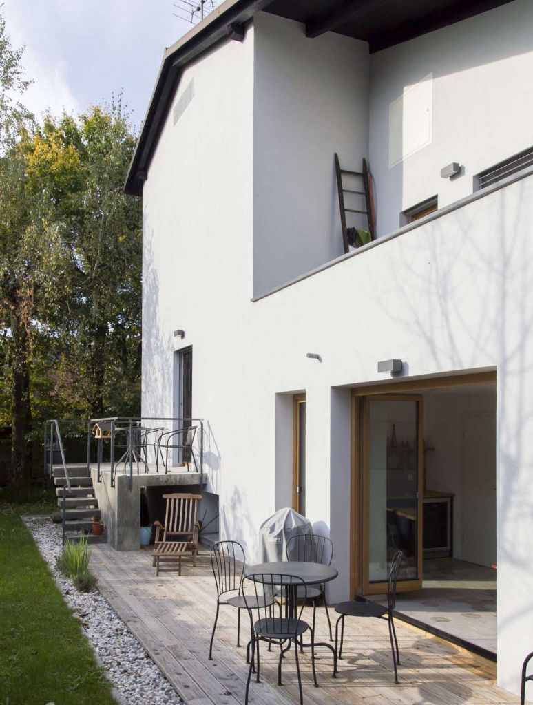 Zunaj smo objekt oblekli v belo fasadno opno, kar mu da sodoben izgled. Primerna izolacija in menjava oken je omogočila tudi subvencioniranje prenove. Vhodna niša je obarvana črno, kar jasno signalizira prostor zavetja ter vhoda v dom.