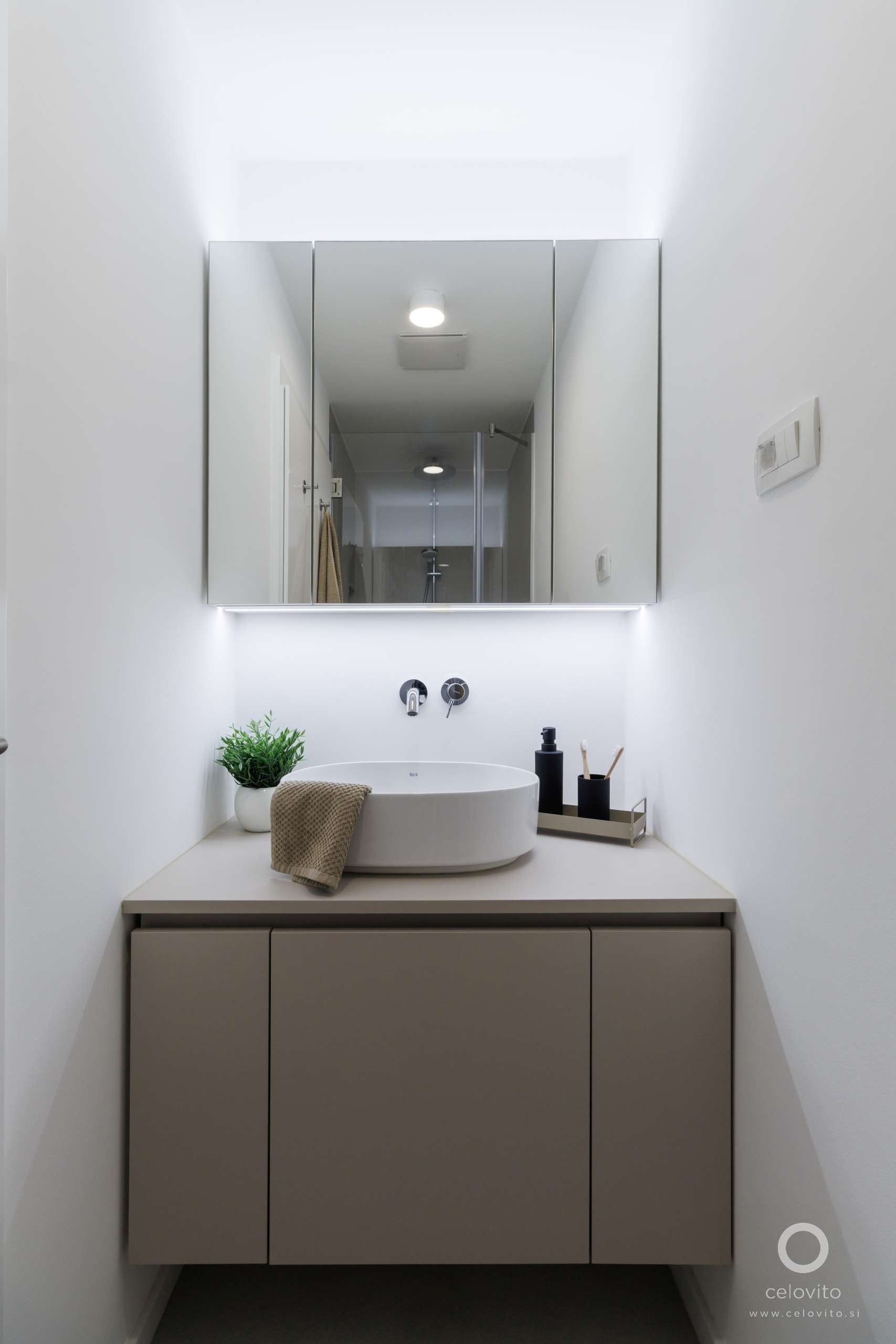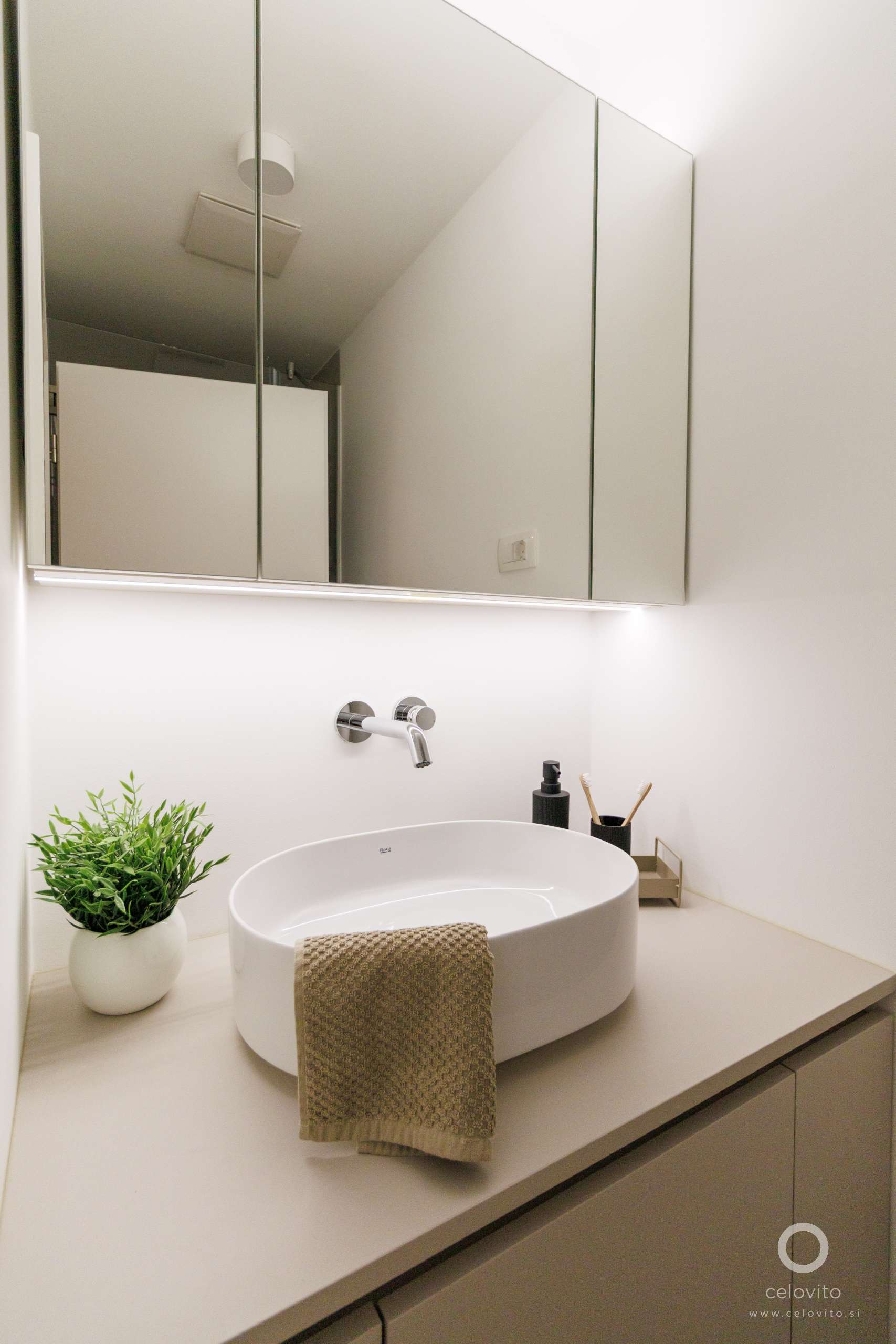 Tako smo v prenovo vključili tudi kose starinskega pohištva, hkrati pa kot protiutež izbrali čiste linije. Združenje tradicije in sodobnosti smo dosegli z oblikovanjem posebnih niš in detajlov, kot so stenske bordure in menjave barve opleska, ki dajo starinskemu pohištvu primeren kontekst, da kljub svoji starosti deluje sveže in sodobno.