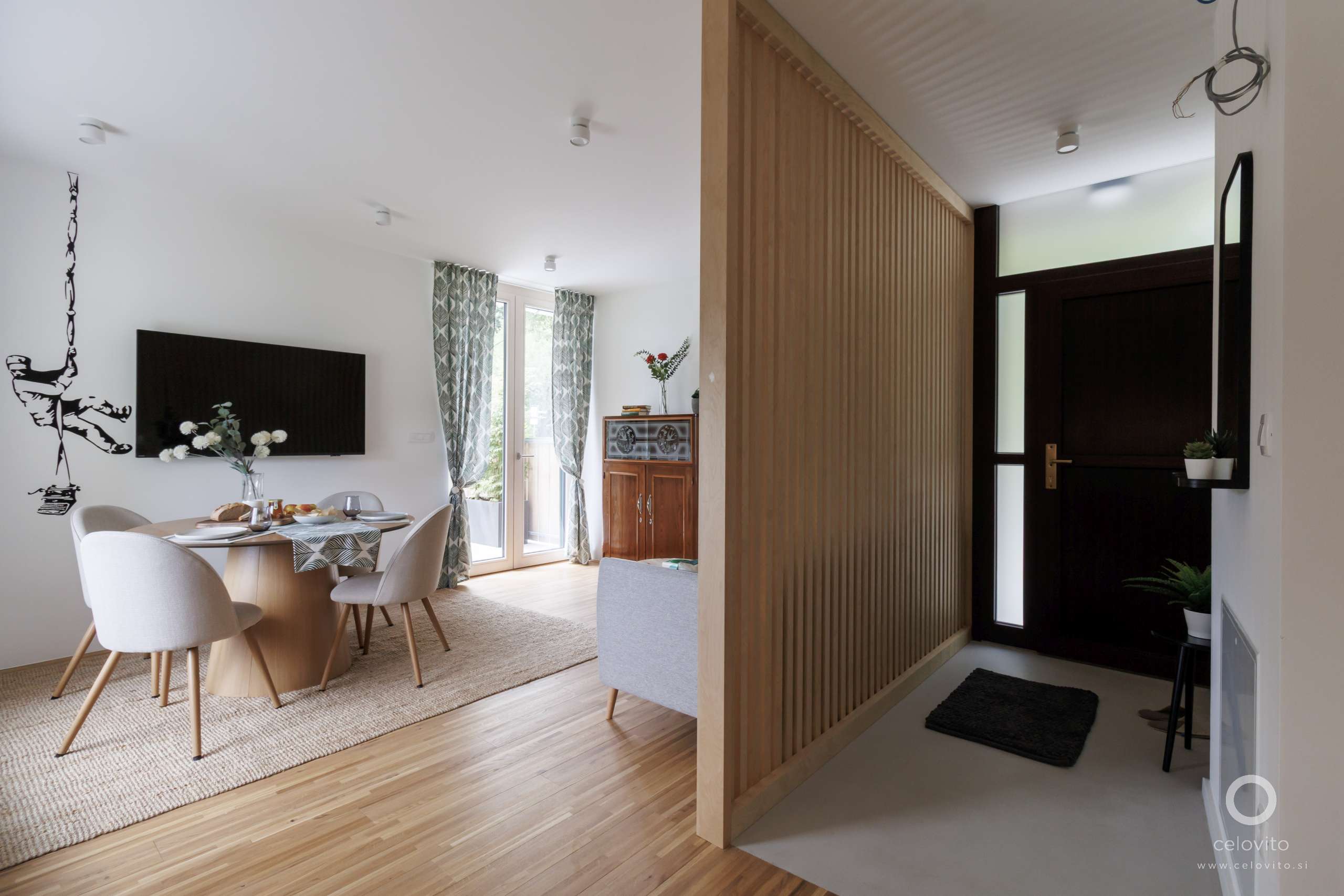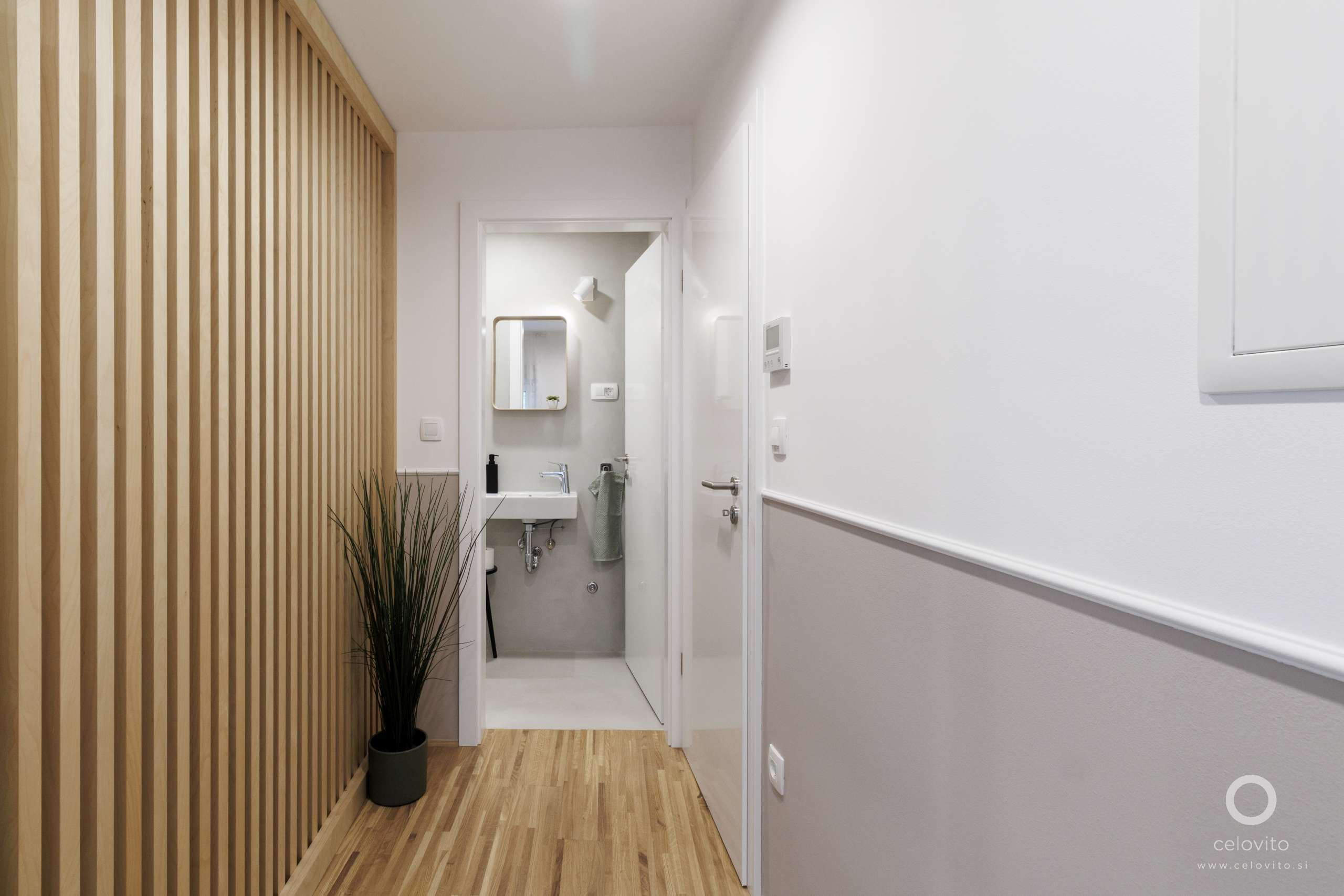 Eno od pregrad smo tako postavili v bivalni prostor in razmejuje vhod in preostali del prostora. Pri vizualni ločitvi je letvicam v podporo tudi menjava talne obloge, ki iz hladne elegance betonskega tlaka v predprostoru, ki prizemlji in prečisti misli, preide v toplo zavetje, s parketom obloženih, dnevnih prostorov.