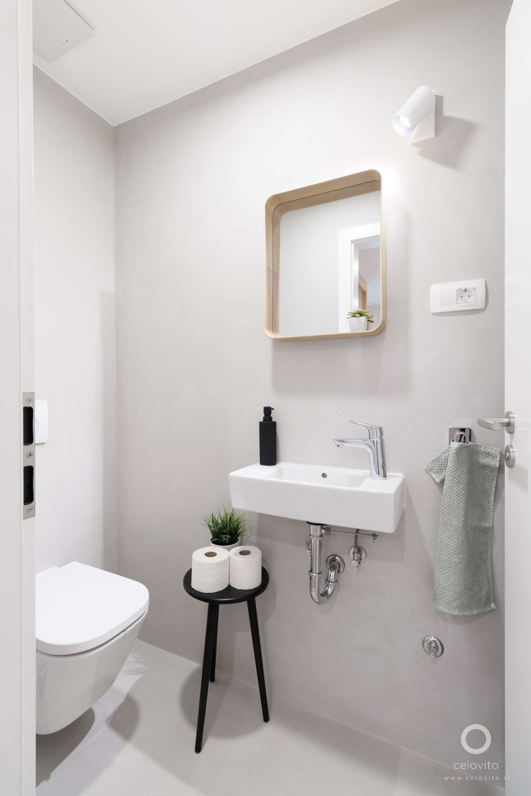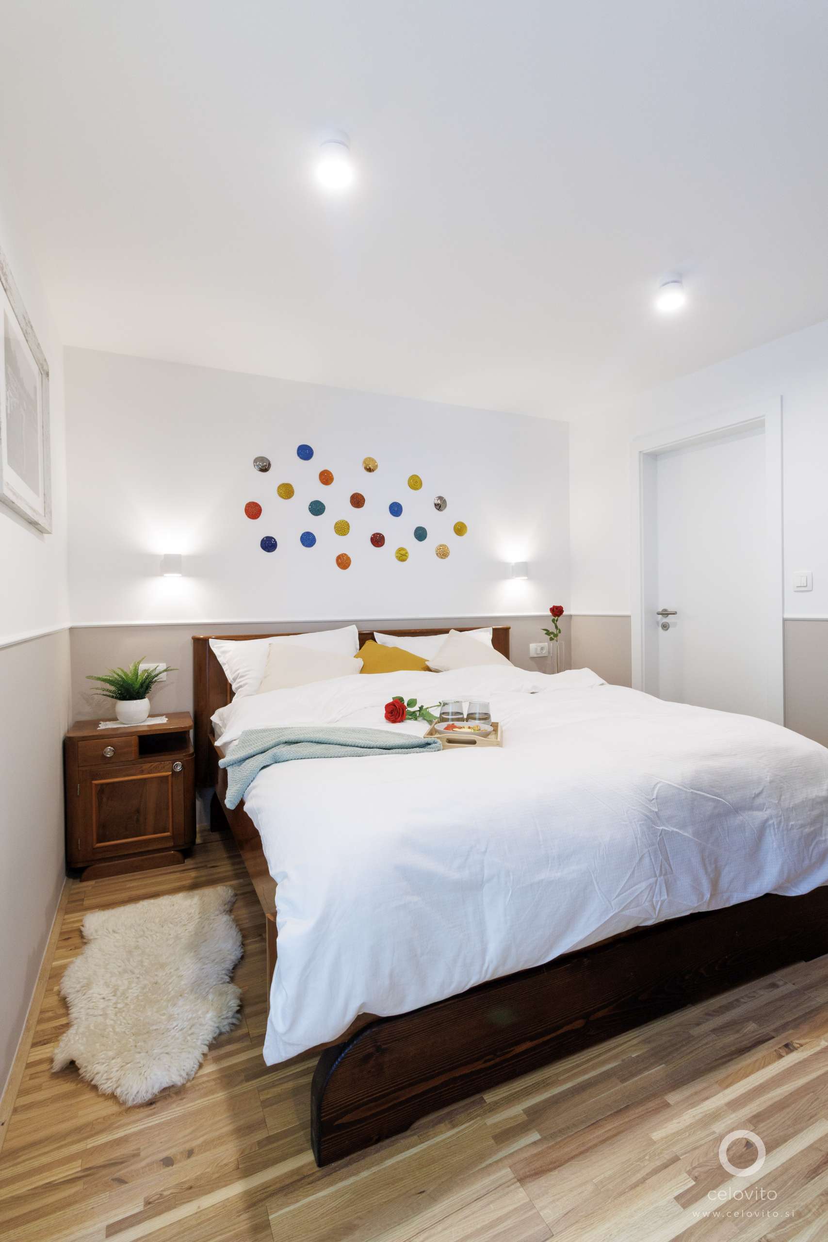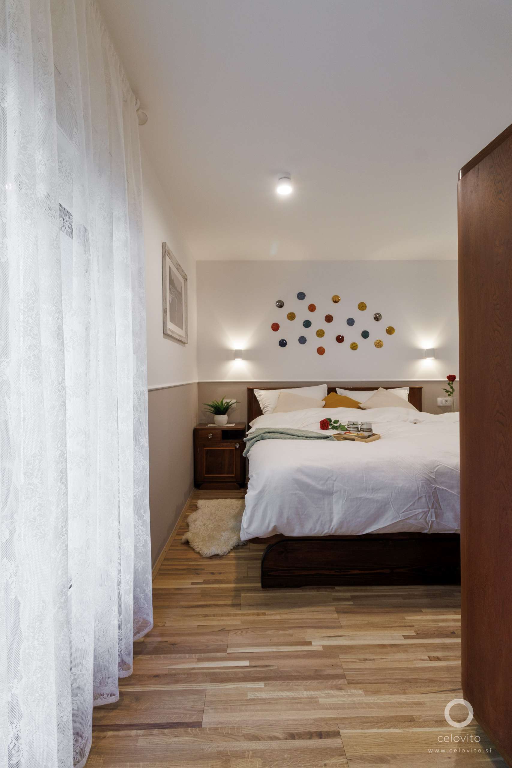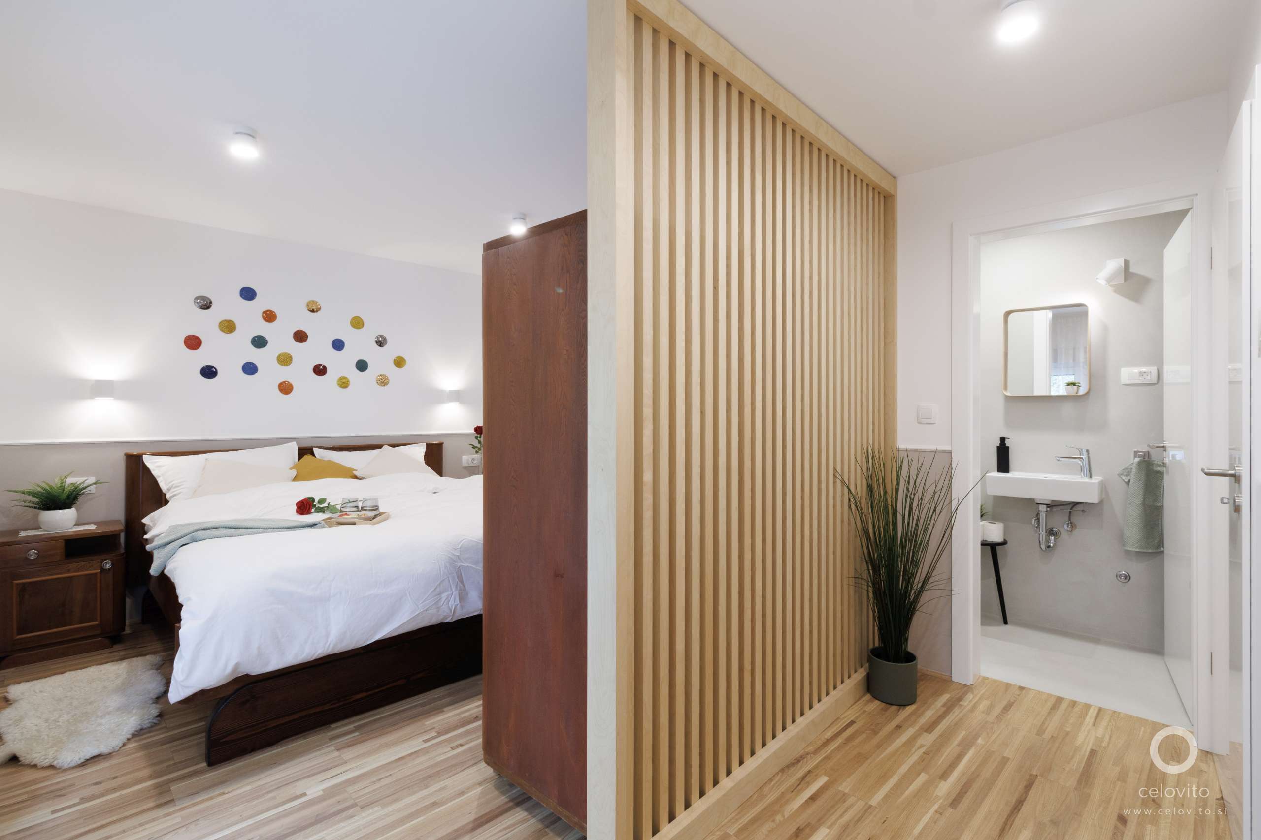Drugo predelno steno smo umestili v prostor spalnice. Omogočili smo, da je WC, čeprav tehnično v območju spalnice, vizualno ločen in bližje bivalnemu delu. S tem smo gostom omogočili diskreten dostop, ne da bi morali hoditi skozi spalnico. V isti liniji z WC-jem je še kopalnica, v katero je dostop iz spalnice.