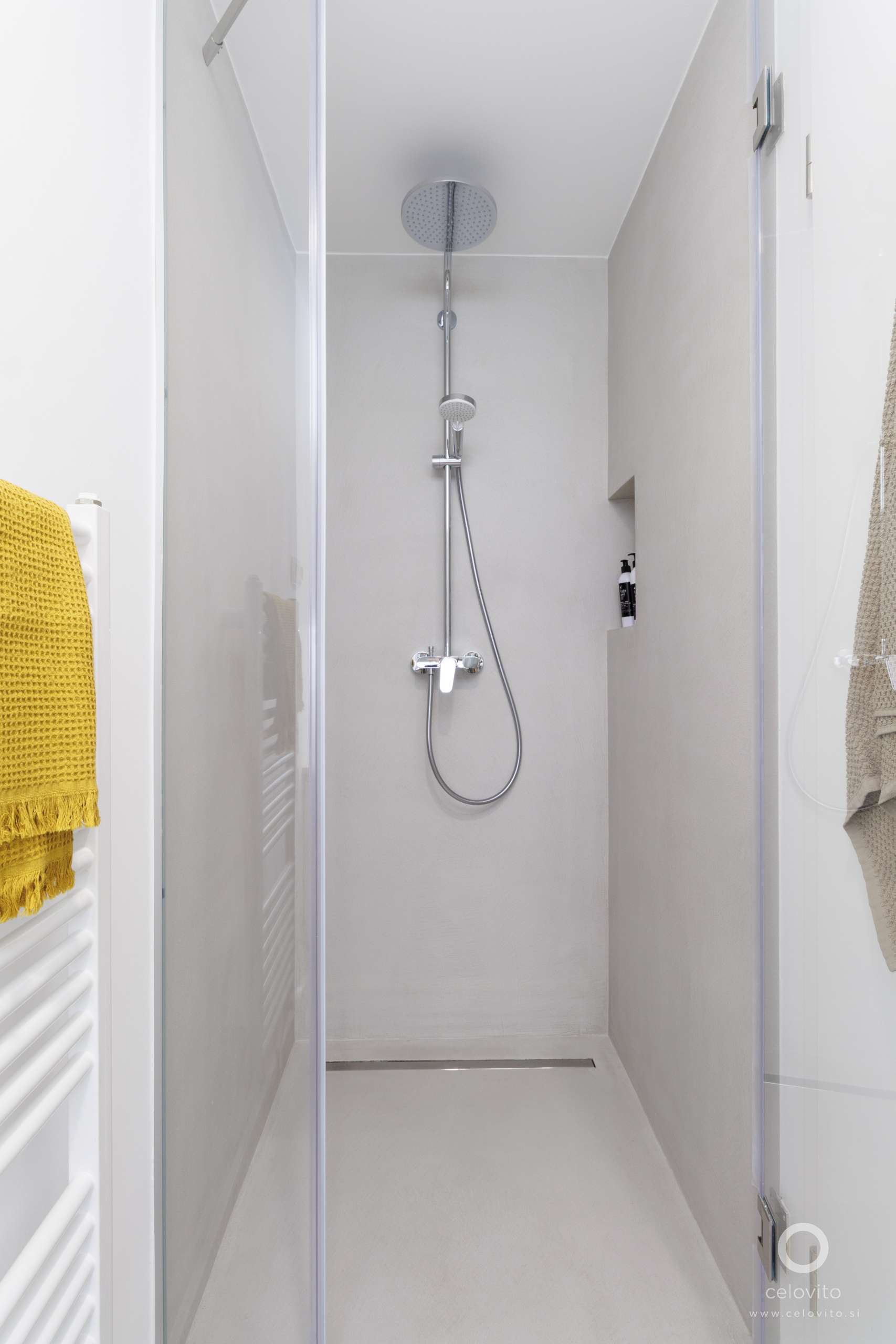 Naš projekt je obsegal celovito prenovo manjšega pritličnega stanovanja kvadrature 44 m², ki se odlikuje s pravljičnim pogledom na Blejsko jezero. A lahko bi rekli, da začetek ni bil tako pravljičen. Objekt se je ponašal z arhitekturno posebnostjo, ki nam je vzela kar nekaj časa. Noben prostor ni imel pravokotnega tlorisa, temveč so stene med seboj tvorile različne kote – kar je v prenovi vedno zabaven izziv! Dodatni podvig so bili zunanji prostori, ki so jih uporabljali kot skladišče in kotlovnico. Bili so v slabem stanju, hkrati pa nas je motilo mimobežno cestišče malce preblizu objekta.