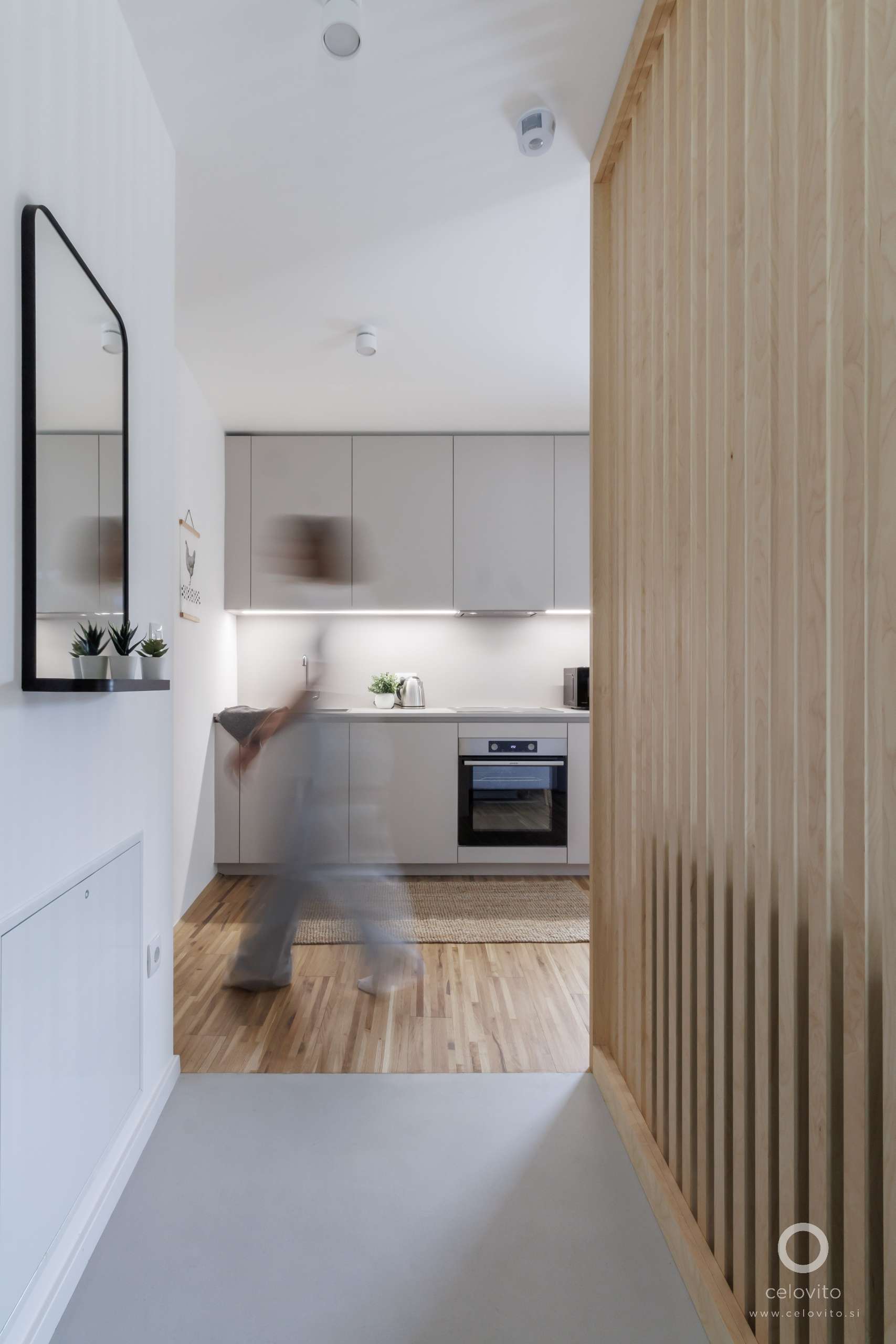 Največji izziv je bil kako rešiti potrebo po dodatnih ‘servisnih’ prostorih (vhod, kopalnica, WC) a hkrati ohraniti čim boljšo povezanosti in zračnost sicer majhnega apartmaja. Rešitev se je porodila v obliki pol-prosojnih predelnih sten. Te lesene pregrade iz letev omogočajo ločevanje prostora na manjše, funkcionalne enote, ne da bi pri tem prostore naredili utesnjene. Gibanje skozi apartma tako poglede venomer spreminja – ponekod se pogled odpre, drugod zameji. Z njimi smo tudi nekoliko omehčali nepravilne oblike glavnih prostorov, ki so nastale zaradi dodatnih kopalniških in servisnih prostorov.