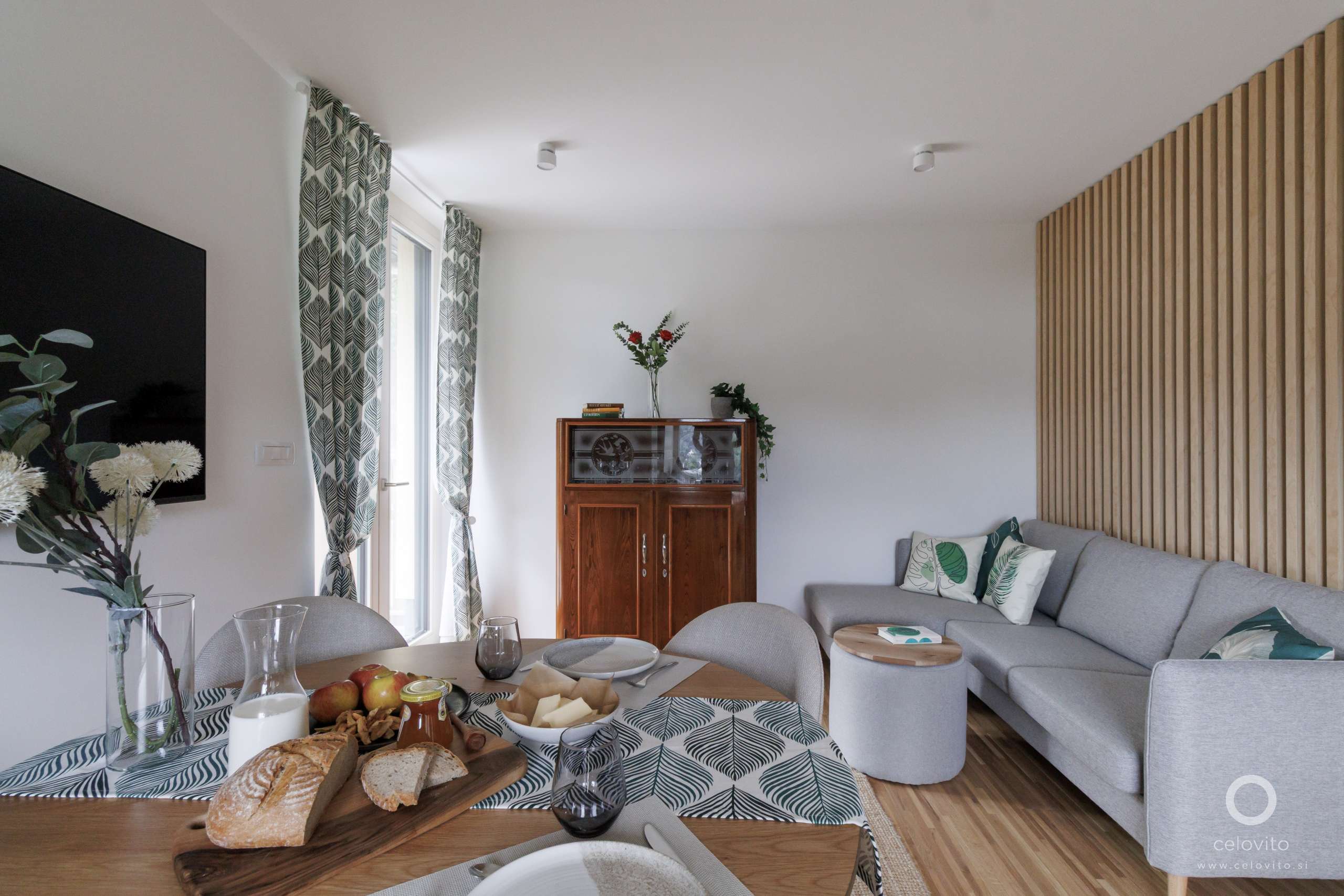 Dnevni prostor je od vhoda vizualno ločen z letveno predelno steno.