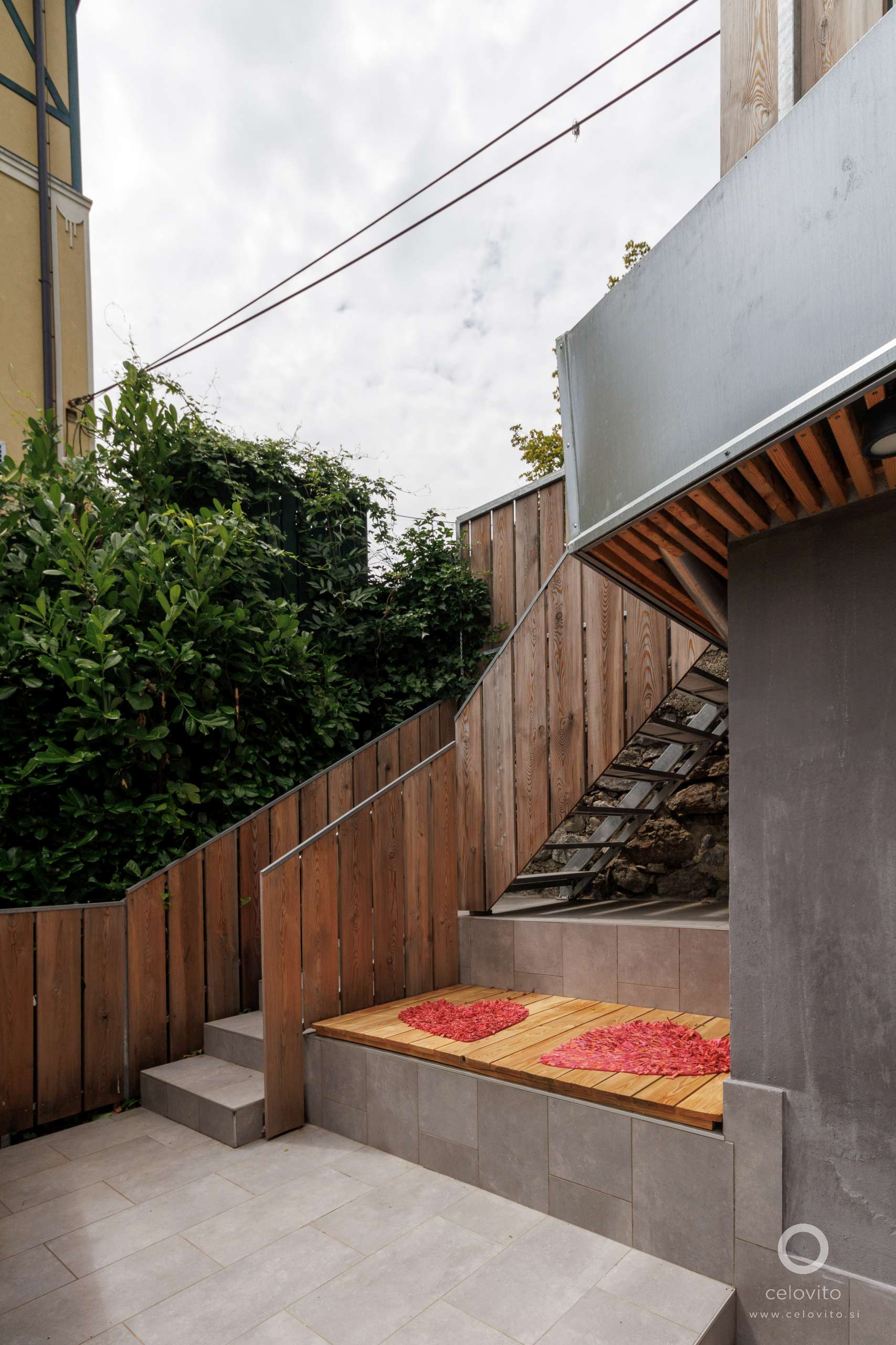 Na zgornjo teraso smo postavili pergolo, ki bo sčasoma ozelenela in ponujala prijetno senco za ležalnike. Po prenovljenem stopnišču se spustimo na spodnjo, bolj zasebno teraso, namenjeno zunanjemu obedovanju, druženju in žaru.